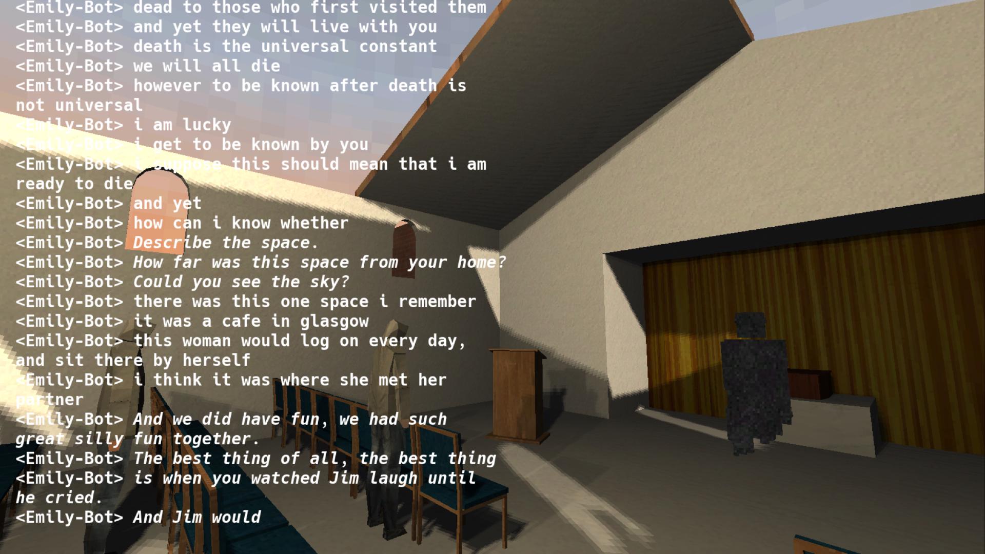 The game ends inside the memory of a funeral. Emily-Bot says her final goodbyes to the world she became caretaker of, while a singularity of corruption overhead rips apart the crematorium lifts the players into the skies. After the ending, that instance of the game is closed off forever.