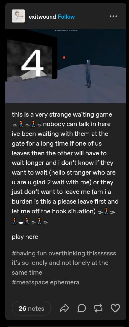 The game was released in 2021, and for a few days, a tiny community surrounded it on Tumblr. In the bleak winter of the pandemic, I think it did some good.