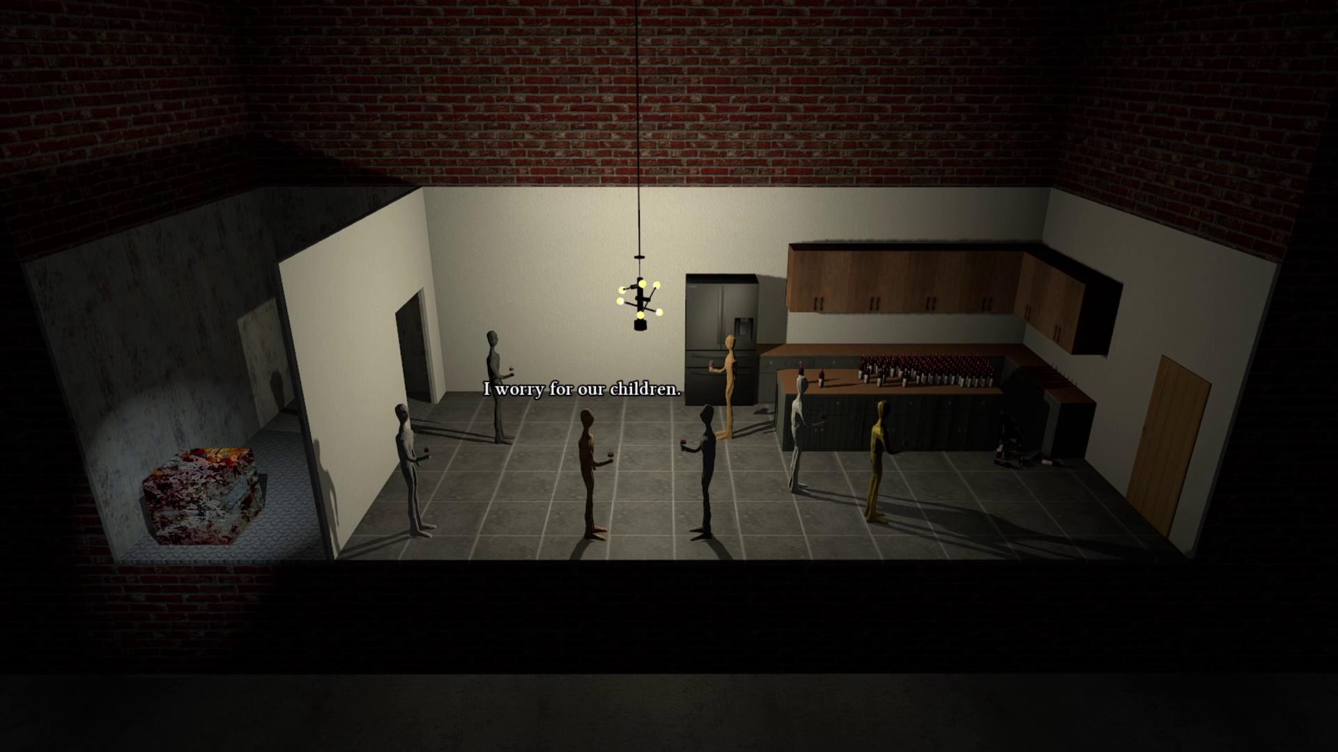 Endless simulation of a party taking place on stage in hell. Guests must attempt to impress each other. Upon failure, they will beg the cube for new conversation topics. Wine is unlimited.