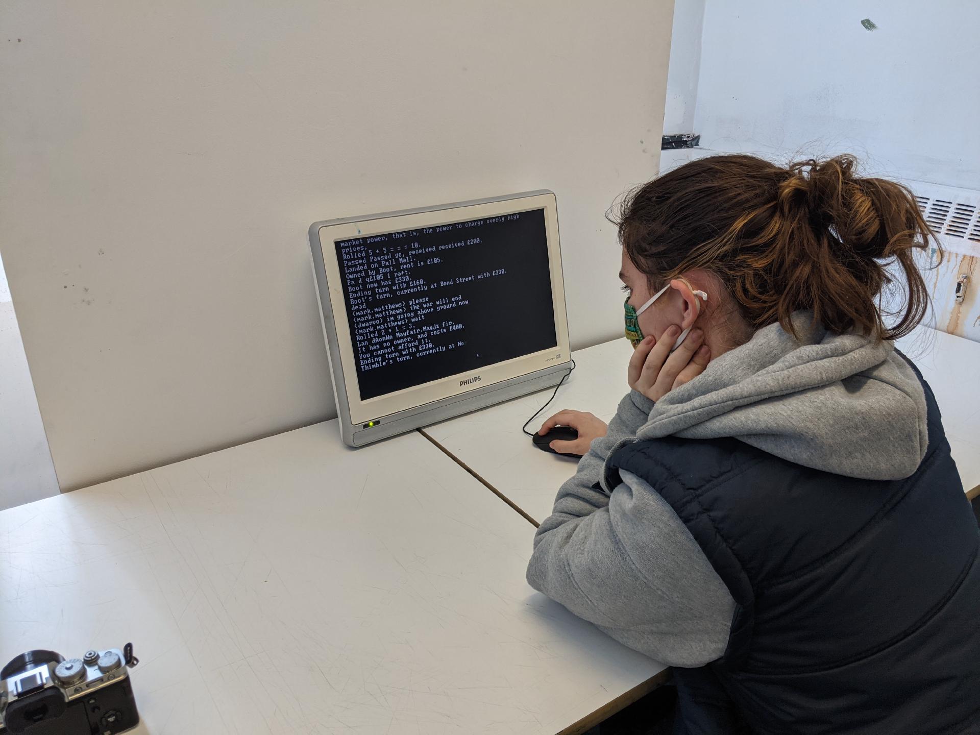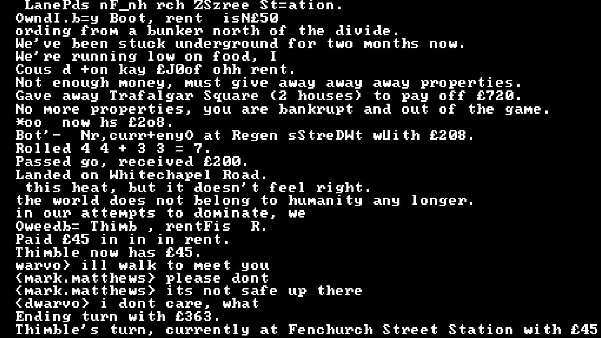Text-based version of Monopoly. As rent and properties get extracted and players get eliminated, the text corrupts and reveals the truth of the system.